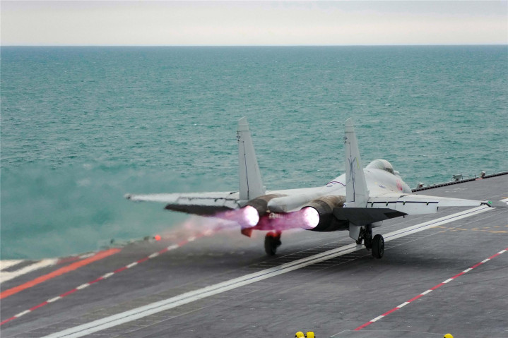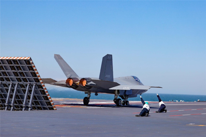 歼15T、歼35和空警600三型舰载机初次在福建舰上弹射升起(照相:岳书华)